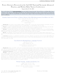 These abstracts represent a broad range of neonatal and perinatal issues. By sharing this information we hope to increase awareness of research and innovative programs within the perinatal health care community, and support evidence-based nursing practice. Some abstracts have been edited for publication.